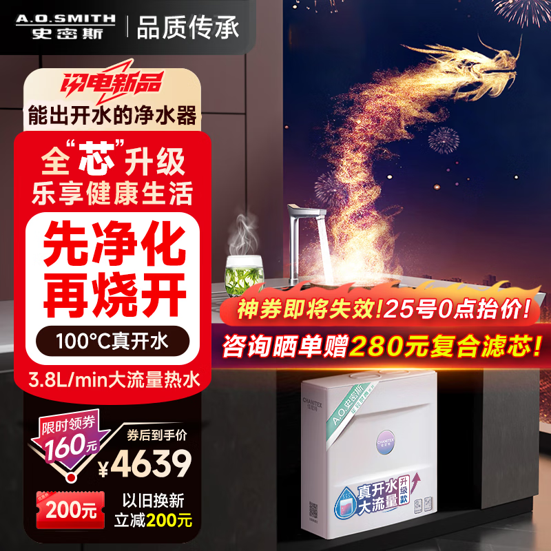 史密斯(A.O.SMITH)佳尼特【龙腾上新】加热净水器厨下家用净水机3.8升/分钟多档控温0陈水CDR2000F【FA1升级款】价格:4799.00元!
