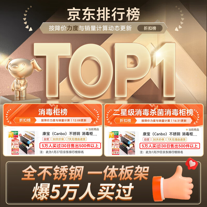 康宝(Canbo)不锈钢 消毒柜 嵌入式 家用 大容量紫外线 消毒碗柜 二星高温小型厨房碗筷餐具大升数XDZ100-EN301价格:1099.00元!