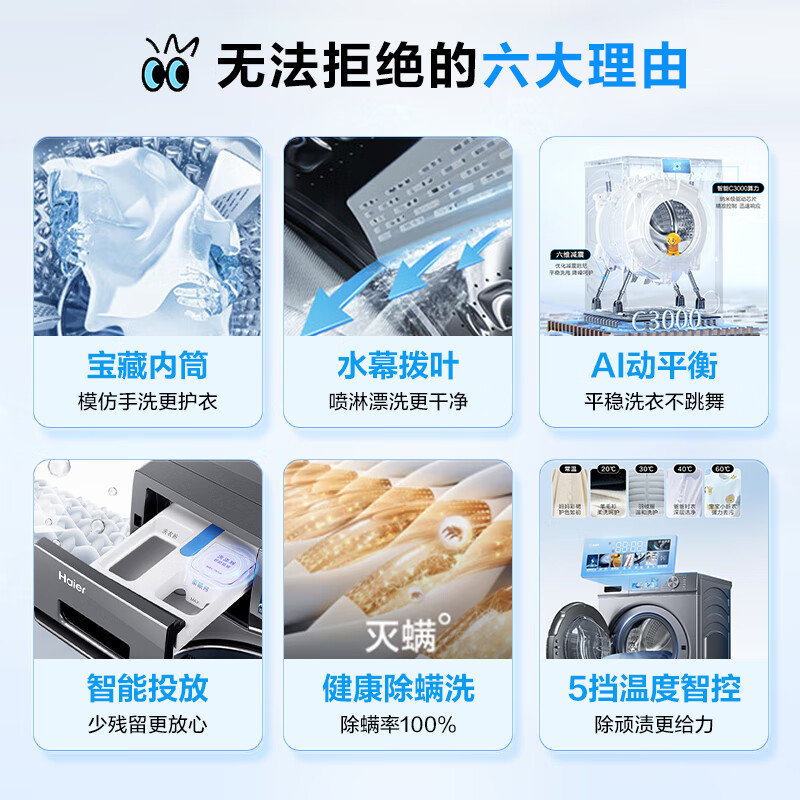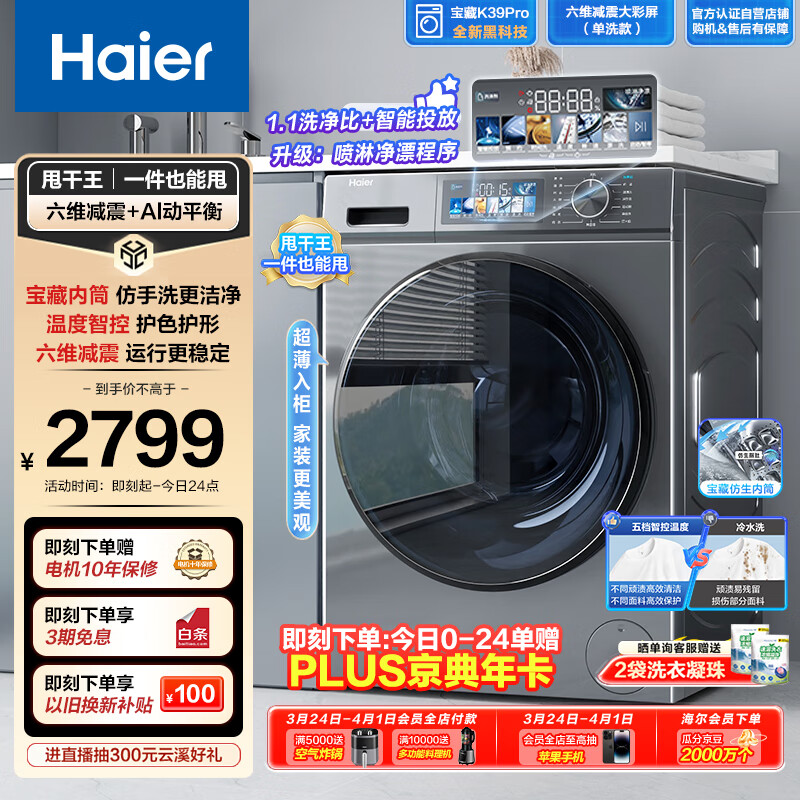 海尔(Haier)滚筒洗衣机全自动 宝藏K39Pro 10公斤大容量 一件也能甩 1.1洗净比 超薄家用以旧换新EG10065S价格:2799.00元!