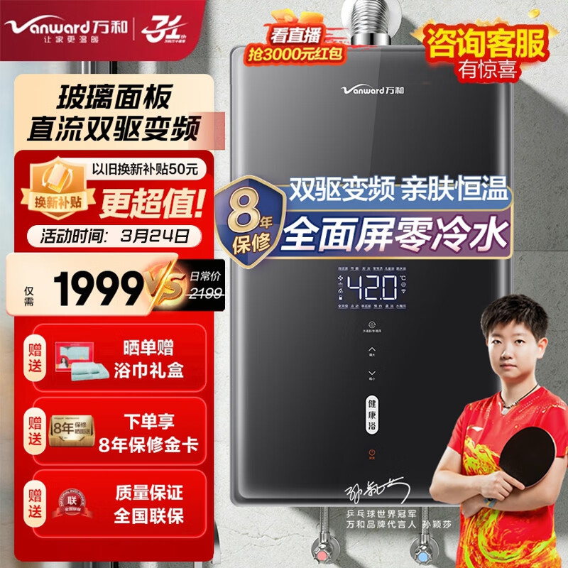 万和(Vanward)16升水增压零冷水燃气热水器天然气无边屏双驱变频 JSQ30-SP5J16价格:2239.00元!
