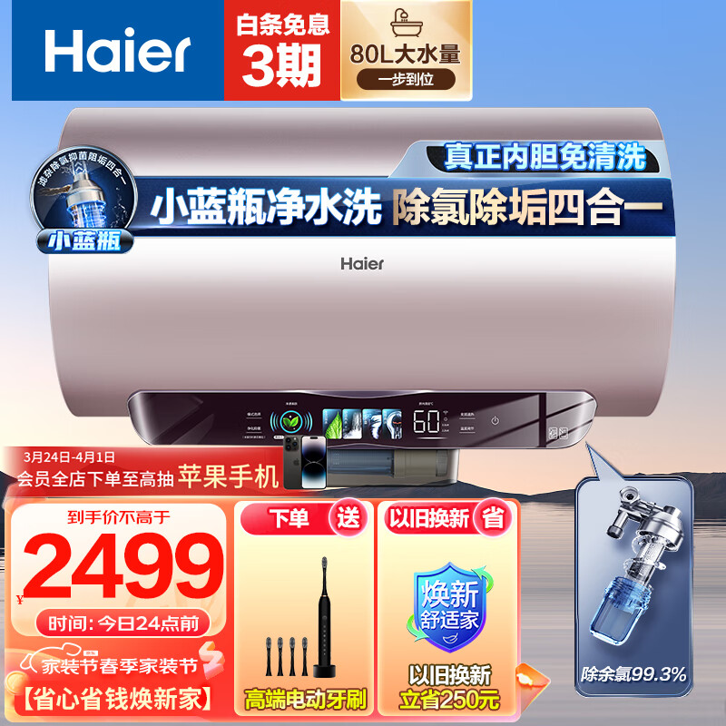海尔(Haier)80升【小蓝瓶】瓷净美肤电热水器家用储水式3300W变频速热一级能效镁棒免换大水量 EC8002H-WP3AU1价格:2699.00元!