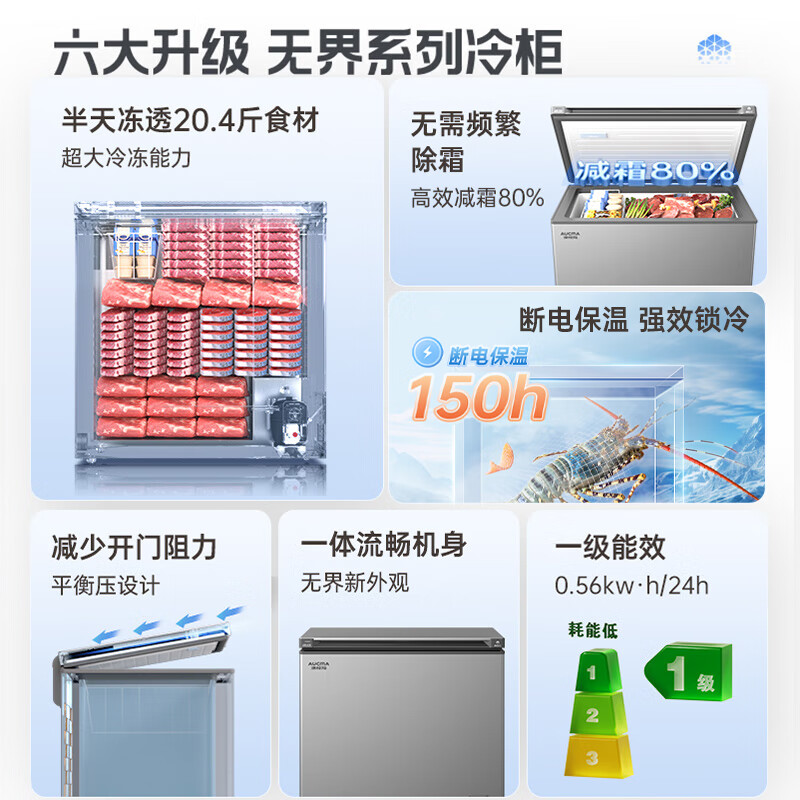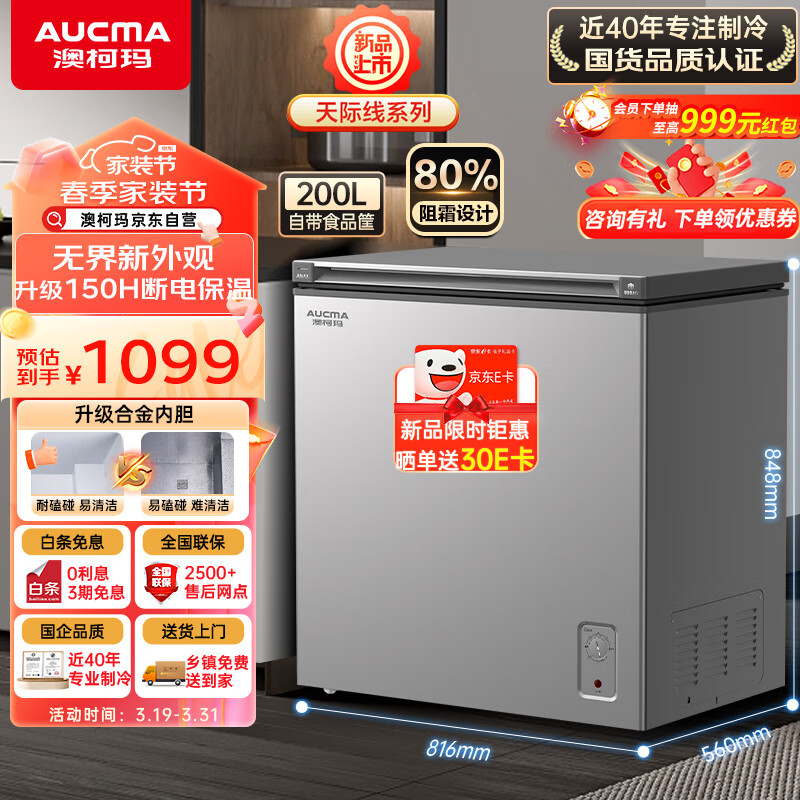 澳柯玛(AUCMA)200升低霜平嵌家用冰柜商用冷藏柜冷冻柜 无界单温冷柜 一级能效 天际线 以旧换新 BC/BD-200HSNE价格:1199.00元!