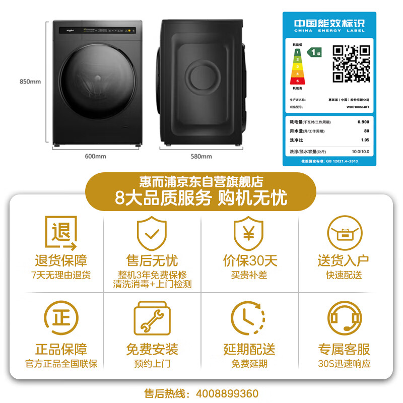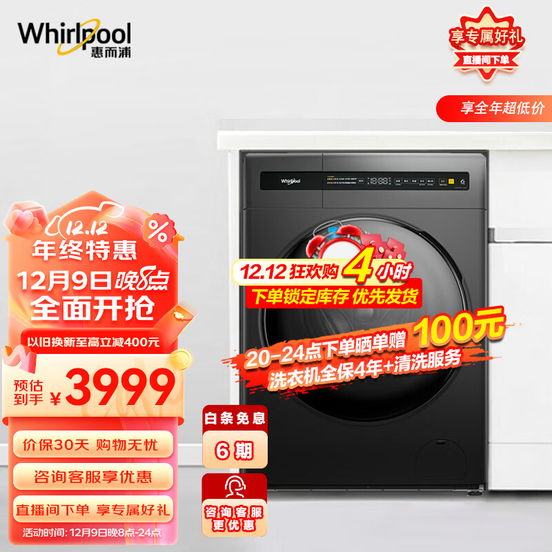 惠而浦(whirlpool)10kg洗衣机洗烘一体机 全自动滚筒烘干机除菌螨 WDC100604RT价格:3899.00元!