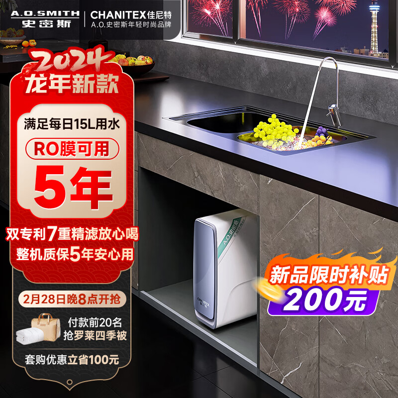 史密斯(A.O.SMITH)佳尼特净水器蓝鲸2000家用厨下式直饮净水机专利MAX5.0反渗透 0陈水CR2000AB1价格:2999.00元!