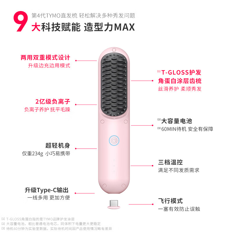 TYMO【戚薇同款】第4代无线直发梳负离子护发不伤发便携两用持久造型美发梳直板夹价格:499.00元!
