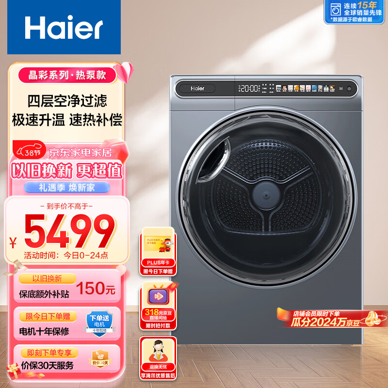 海尔(Haier)晶彩烘干机家用 10公斤热泵干衣机?空净过滤 羊毛柔烘 除菌净螨 专业护衣 EHG100MATE59以旧换新价格:5499.00元!