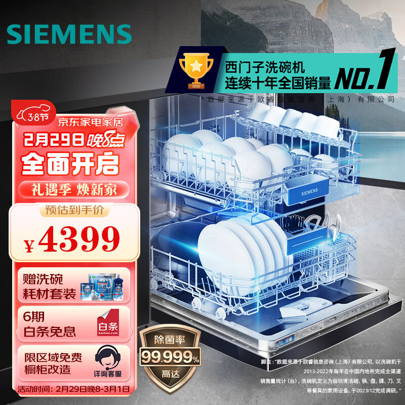 西门子 12套大容量家用除菌洗碗机嵌入式 独立式 独嵌两用 变频 三重烘干 洗烘一体 SJ235B01JC(黑色)价格:4399.00元!