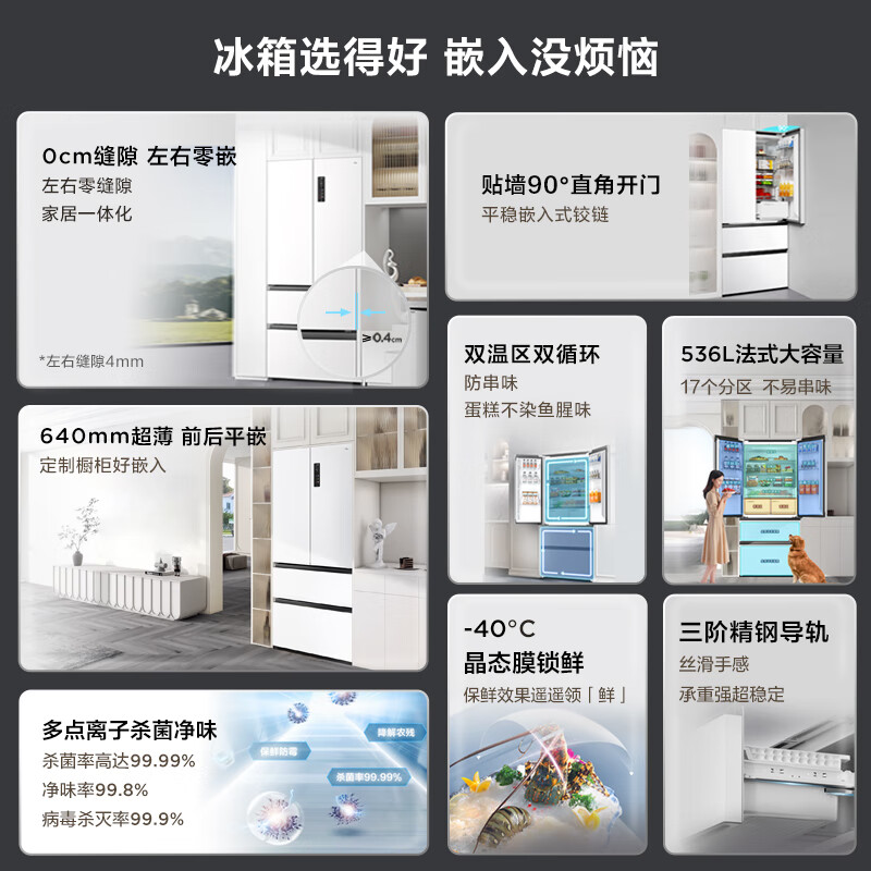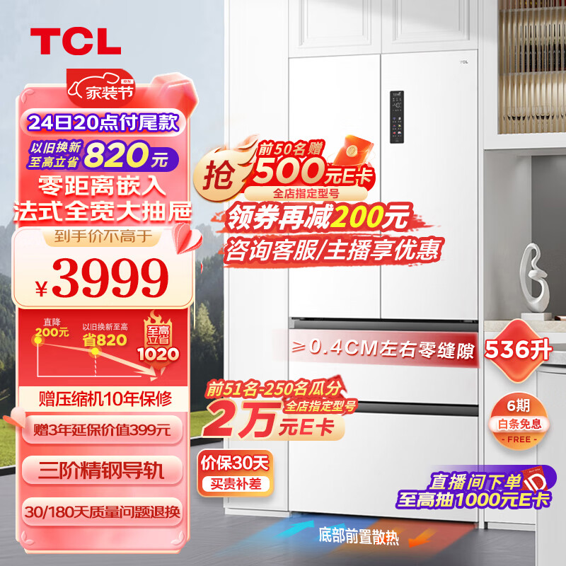 TCL 536升T9法式四门超薄零嵌入式冰箱白色 底部散热 杀菌除味双循环 一级能效家用电冰箱R536T9-DQ价格:4198.00元!