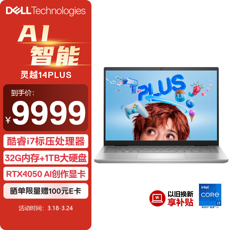 戴尔(DELL)笔记本电脑 灵越14PLUS-7430 14英寸轻薄本办公商务游戏设计 酷睿i7标压 32G 1TB RTX4050 2.5K价格:9999.00元!