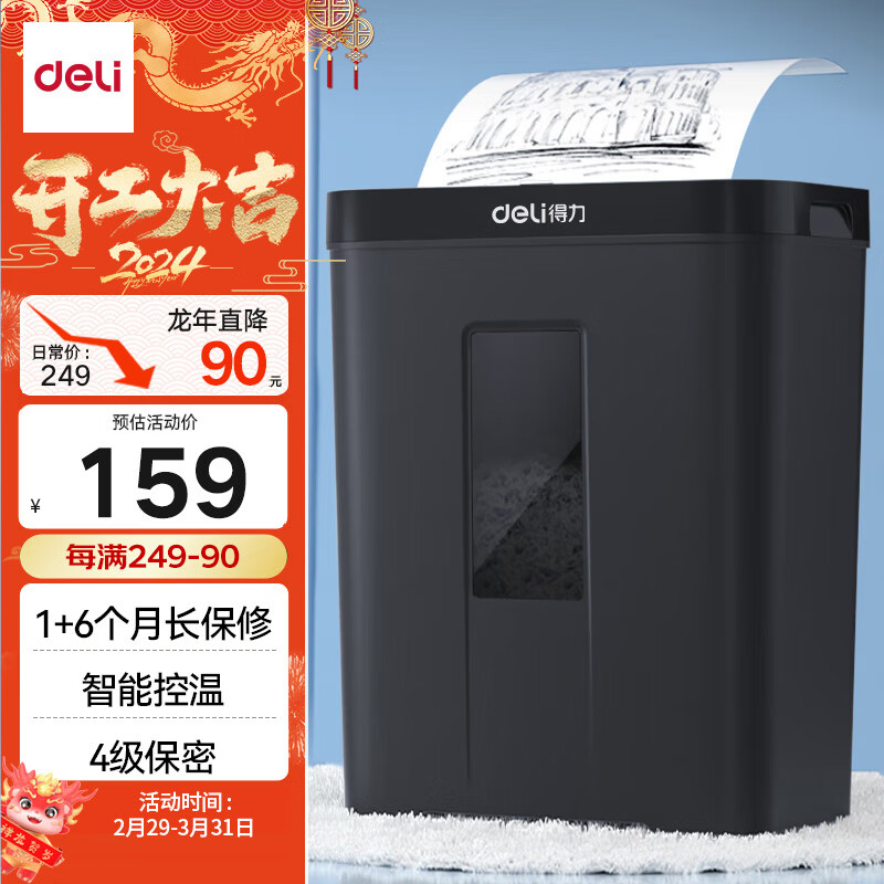 得力(deli) 4级保密个人家用办公商用办公碎纸机(单次5张 15L 持续5分钟 可碎卡)33088价格:199.00元!