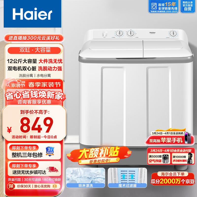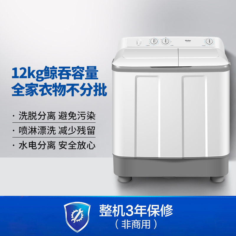 海尔(Haier)半自动双缸洗衣机家电 12公斤超大容量 原厂品质 可洗薄被子 动平衡脱水 水电分离XPB120-729S价格:849.00元!