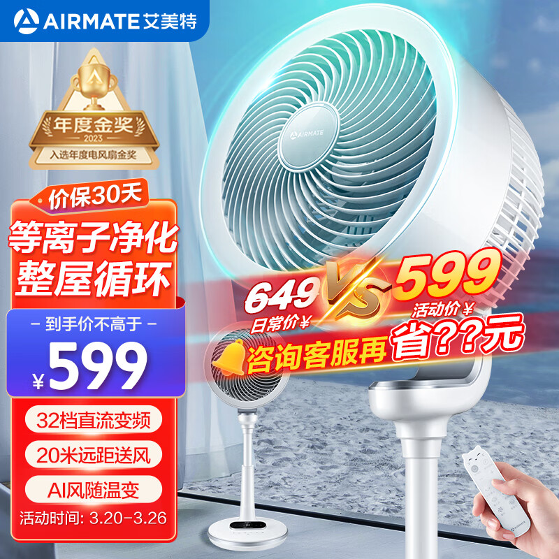 艾美特(AIRMATE)“白天鹅升级款”空气循环扇等离子净化32档直流变频家用落地扇3D自动摇头台立式轻音电风扇 RDI82价格:689.00元!