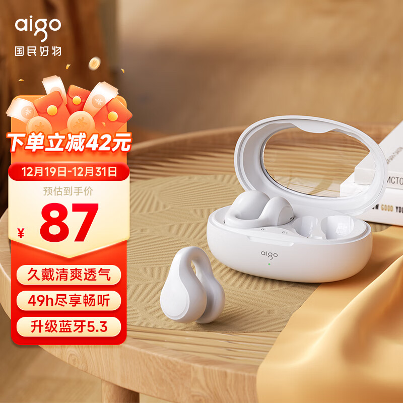 爱国者(aigo)TWS蓝牙耳机 非骨传导耳夹开放式无线不入耳 运动跑步骑行通话耳机 适用苹果华为小米手机 TJ170白价格:87.00元!