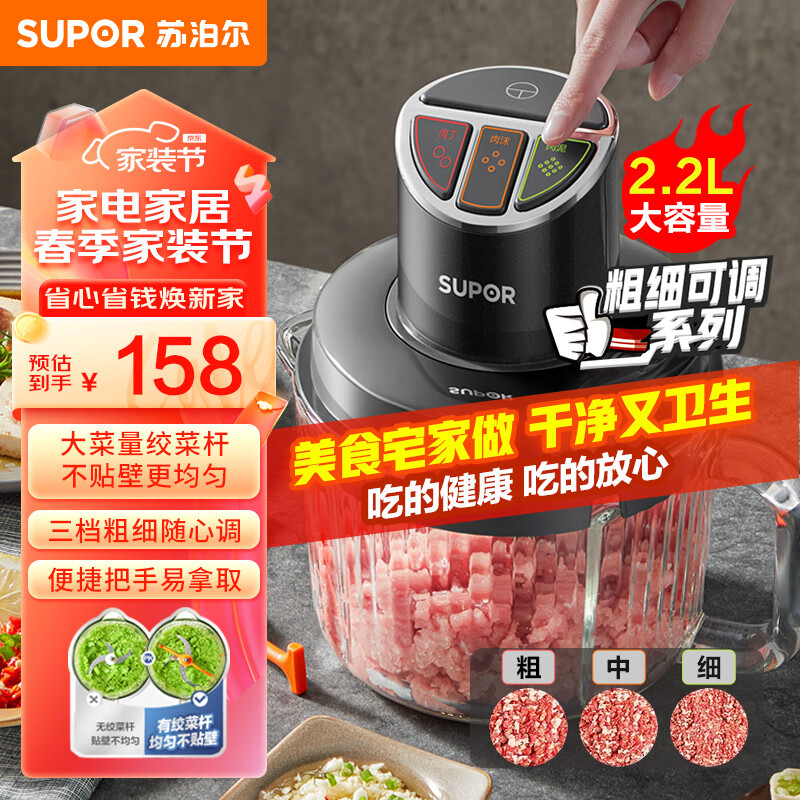苏泊尔(SUPOR)可调粗细绞肉机 家用电动绞馅机多功能婴儿辅食机大容量料理机切菜神器便携把手搅拌机JR59-U价格:158.00元!