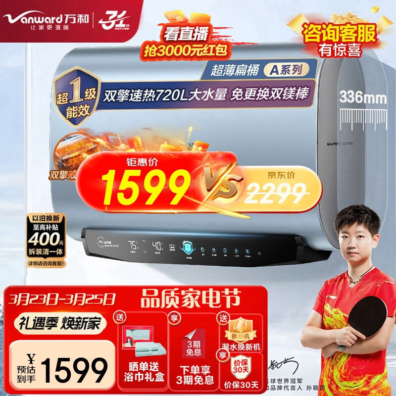 万和(Vanward)60升超薄扁桶电热水器出水断电双擎双胆速热3200W一级能效节能12倍增容镁棒免更换 E60-A6WW30-32价格:1899.00元!