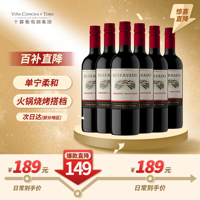 Concha y Toro干露珍藏赤霞珠干红葡萄酒 750ml*6整箱装 热红酒 智利进口价格:149.00元!
