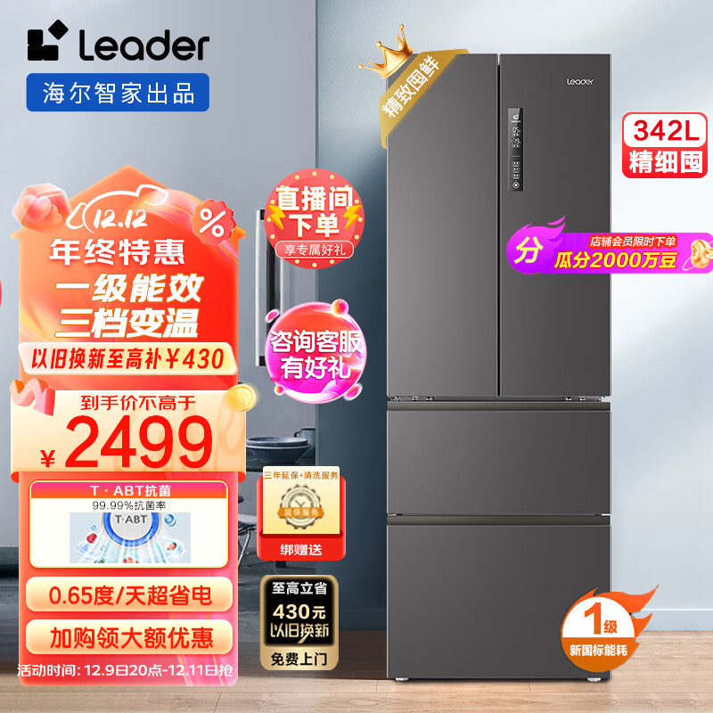 Leader 海尔智家出品342升风冷无霜一级能效双变频变温节能法式四门多门家用电冰箱BCD-342WLLFDD9S9价格:2499.00元!