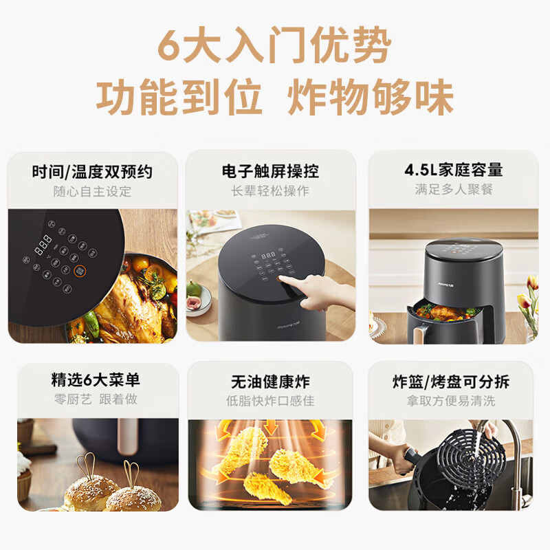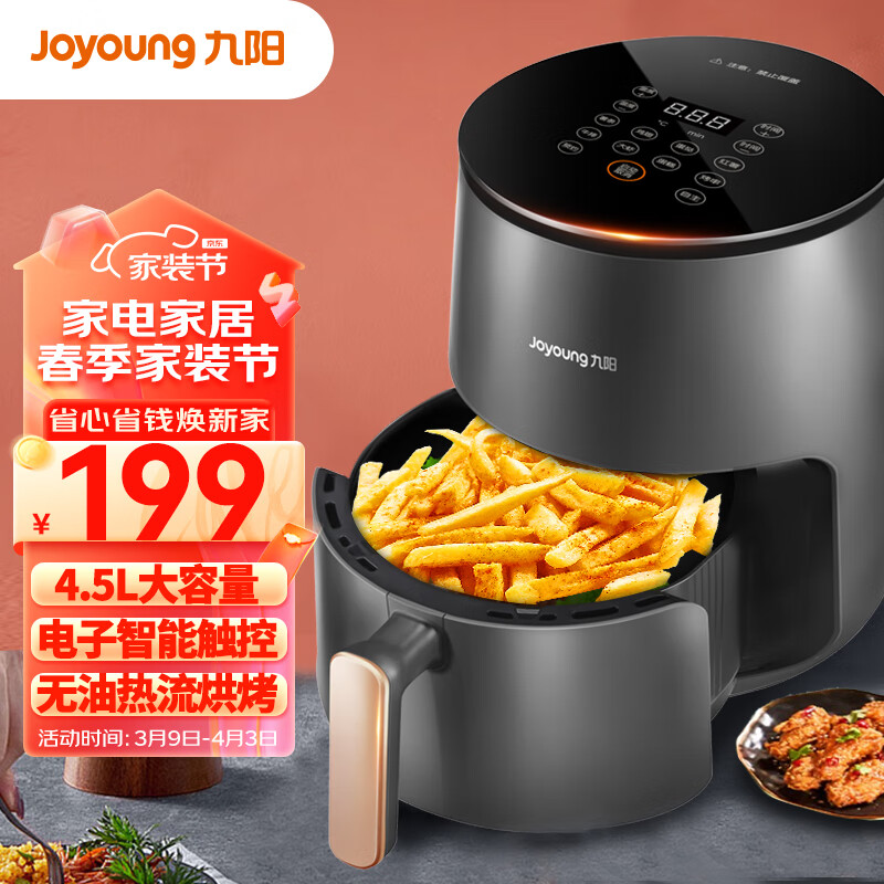九阳(Joyoung)空气炸锅家用智能 4.5L大容量多功能 高端触控屏 无油煎炸 KL45-VF530价格:219.00元!