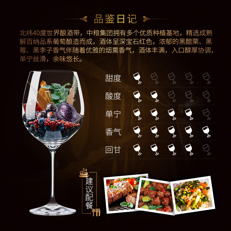 葡萄品种:赤霞珠(CabernetSauvignon),蛇龙珠(CabernetGernischt),品丽珠(CabernetFranc)
