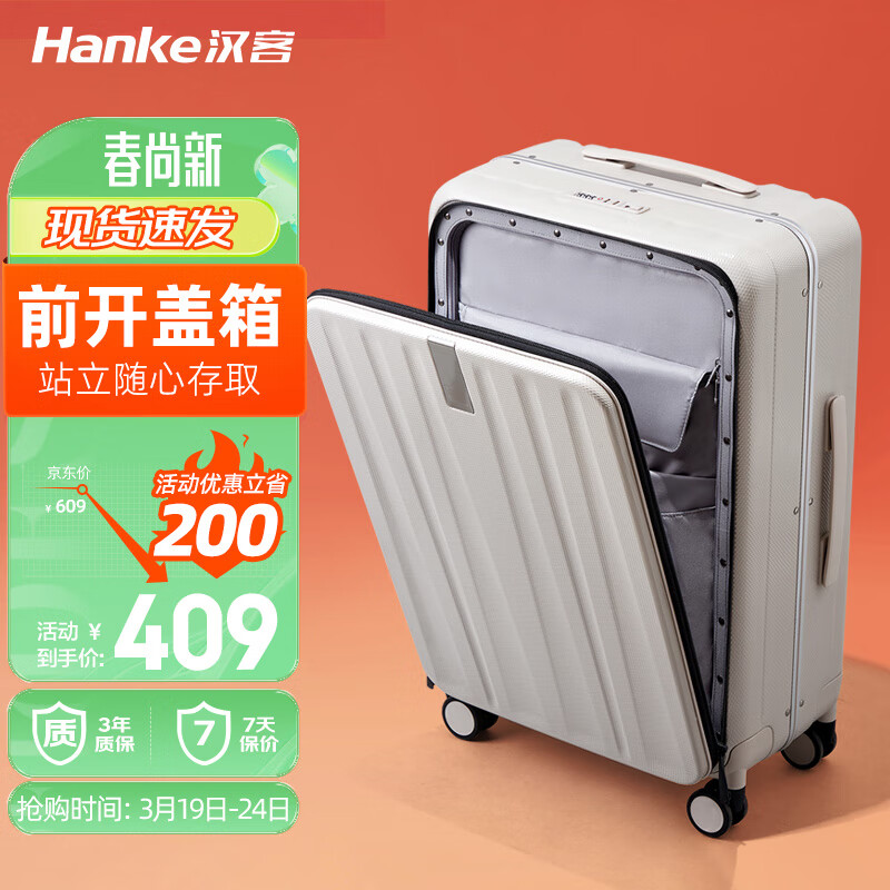 汉客铝框前开盖登机行李箱男20英寸象牙白铝框拉杆箱女密码箱子旅行箱价格:609.00元!