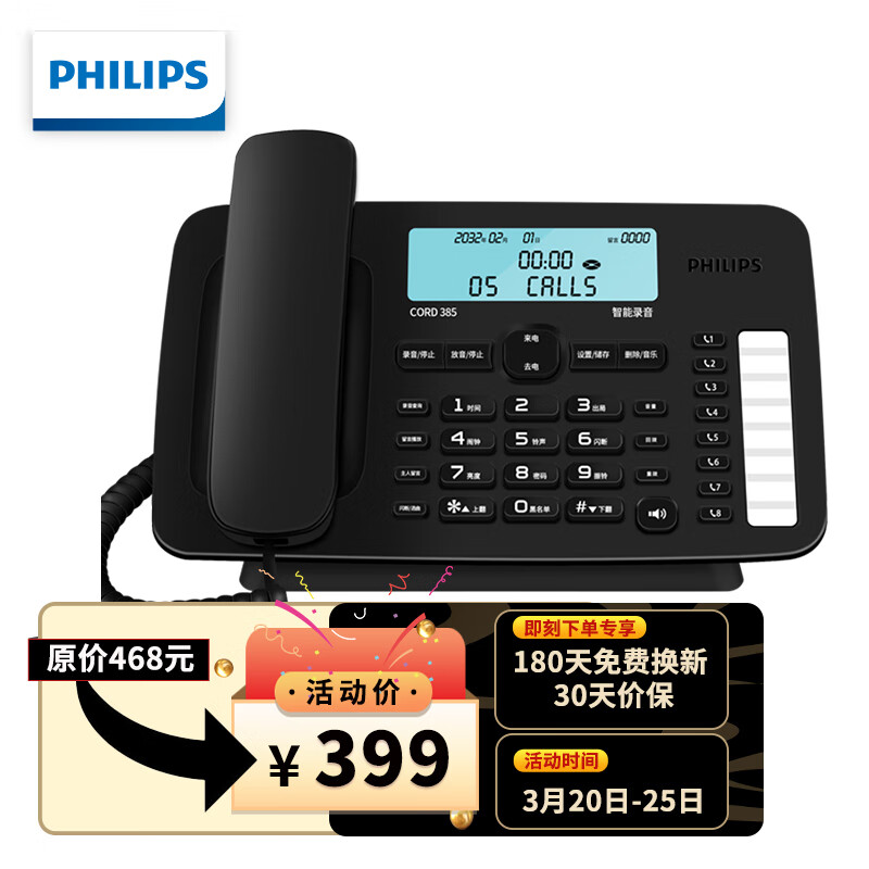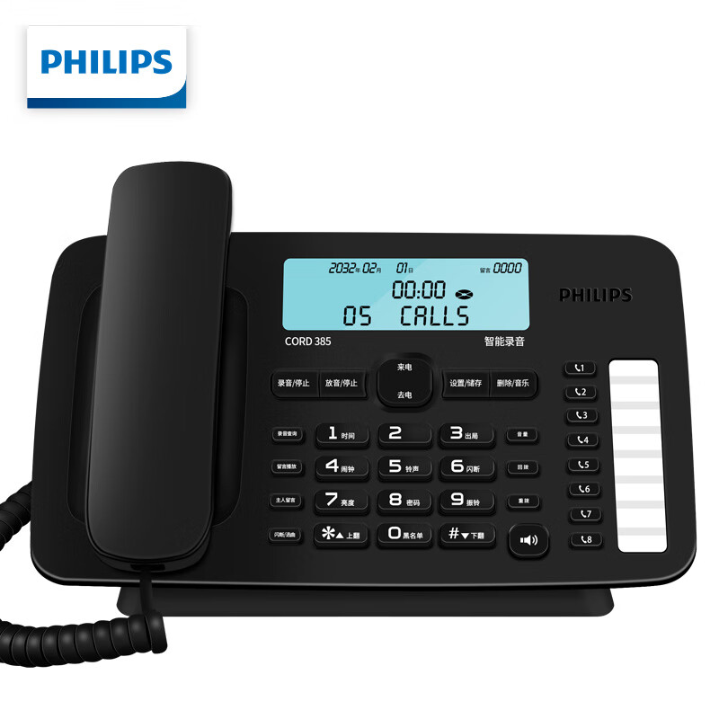 飞利浦(PHILIPS)录音电话机 固定座机 办公家用 自动手动录音 1000小时通话录音机身35度倾角 CORD385 黑色价格:399.00元!