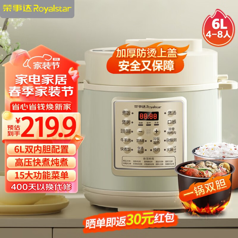 荣事达(Royalstar)电锅6L大容量全自动智能预约家用保温煲汤煮粥 面板易清洁双内胆YDG60-100A260高压锅4-8人价格:229.90元!