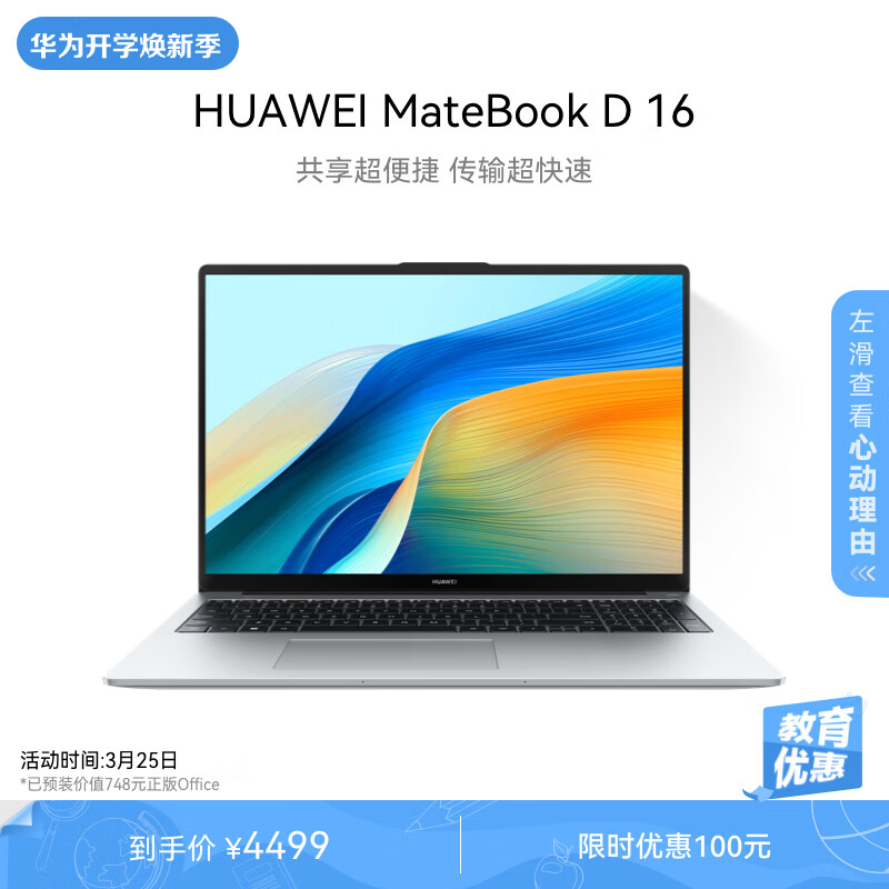 华为MateBook D 16 2024笔记本电脑 13代酷睿标压处理器/16英寸护眼大屏/轻薄办公本 i5 16G 1T 皓月银价格:4599.00元!