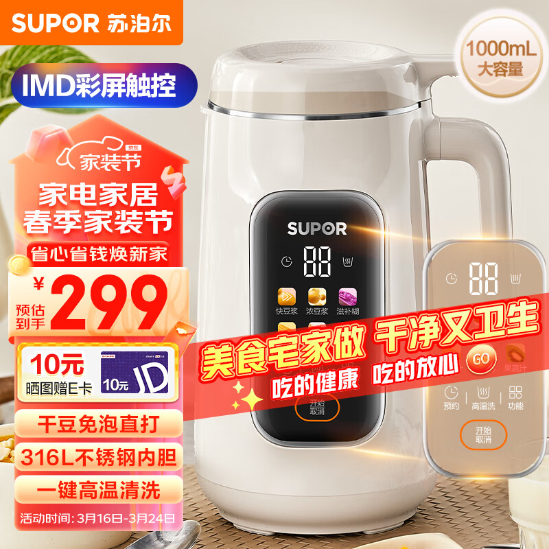 苏泊尔(SUPOR)豆浆机家用1L小型全自动清洗免煮免过滤破壁料理机316L不锈钢内胆双层防烫搅拌机DJ10B-P28E价格:299.00元!