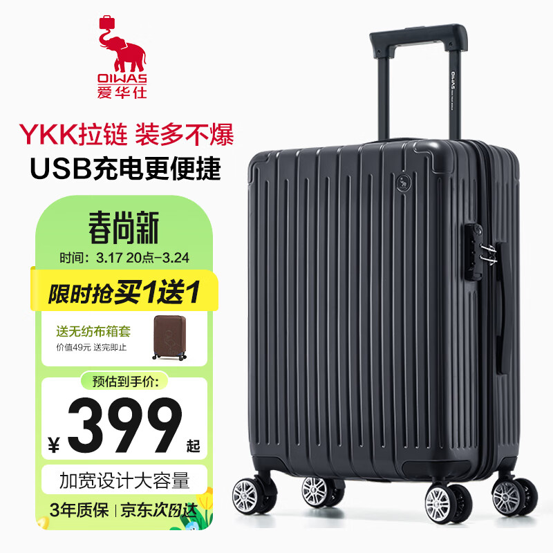 爱华仕行李箱男拉杆箱女大容量旅行箱轻便万向飞机轮24英寸密码箱骑士黑价格:599.00元!