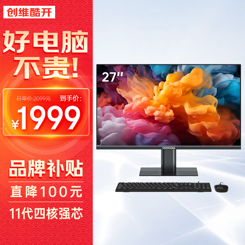 酷开 创维电脑 27英寸办公商用娱乐大屏一体机台式电脑(11代N5095 16G 1TB SSD WiFi5G 蓝牙)价格:1999.00元!