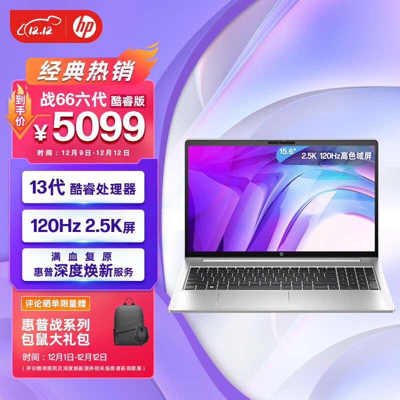 惠普(HP)战66 六代2023酷睿15.6英寸轻薄笔记本电脑(英特尔13代i5-1340P 32G 1T 2.5K高色域屏 120Hz AI新体验高性能)价格:5899.00元!