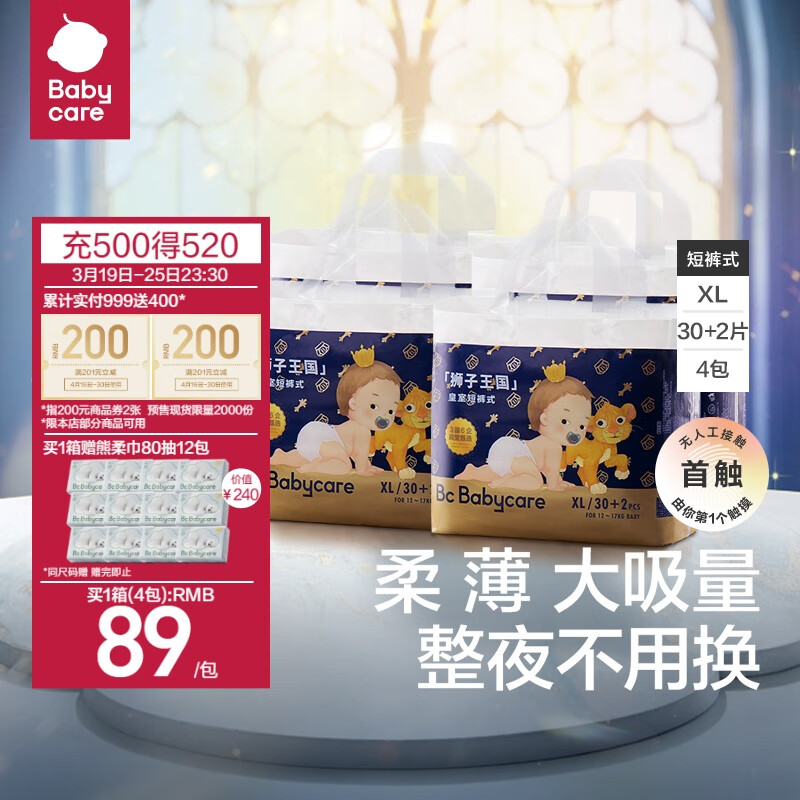 babycare皇冠LaLa裤皇室狮子王国拉拉裤婴儿尿不湿箱装XL30+2*4包 12-17kg价格:476.00元!
