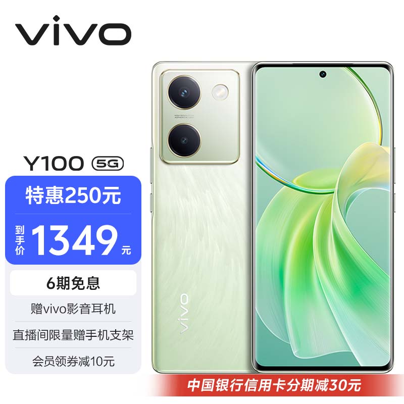 vivo Y100 8GB+256GB 琉云青 超薄5000mAh电池 6400万OIS光学防抖 44W超快闪充 5G 快充 拍照 手机价格:1599.00元!