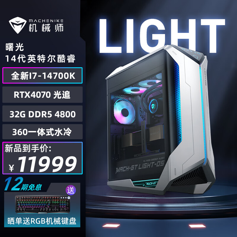 机械师(MACHENIKE)曙光 游戏英特尔台式机电脑电竞主机(14代i7-14700K 32G DDR5 1TSSD RTX4070)360水冷价格:11999.00元!