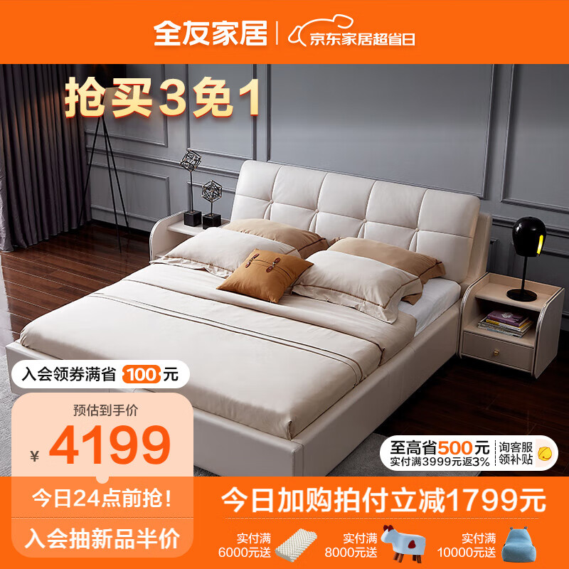 全友家居 真皮艺双人床1.8x2米现代简约主卧室头层牛皮软包大床105135价格:5998.57元!
