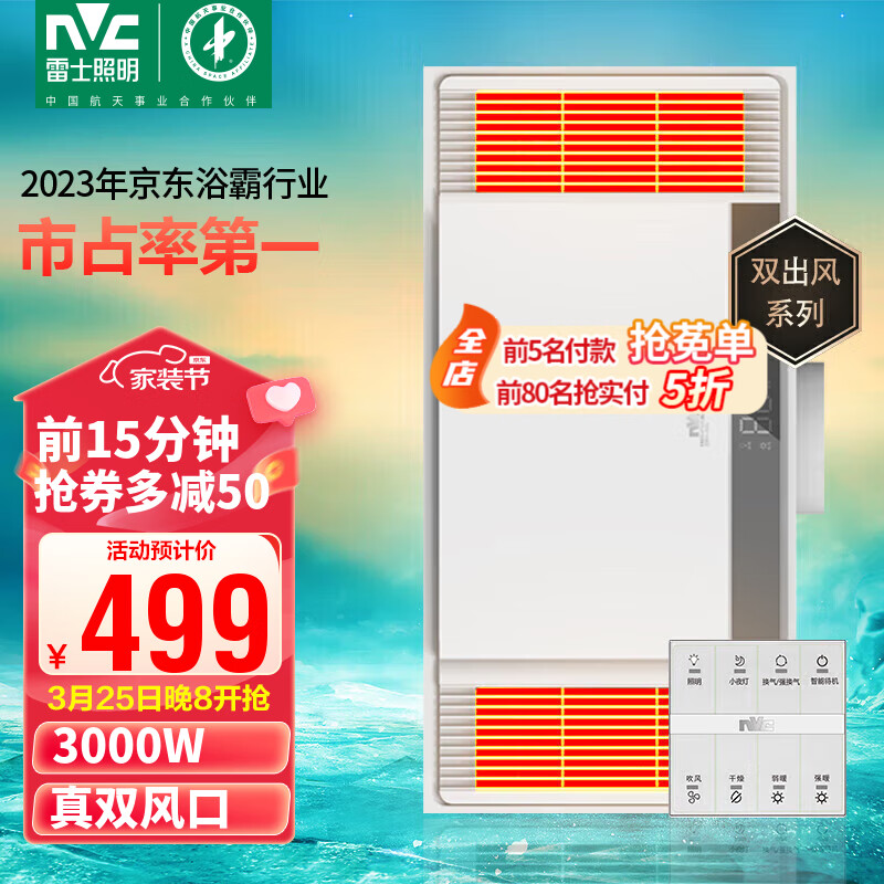 雷士(NVC)双风口取暖/换气风暖浴霸排气扇照明一体卫生间暖风机浴室取暖器价格:879.00元!