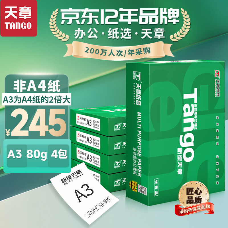 天章 (TANGO)新绿天章A3打印纸 80g 500张*5包 明星复印纸 双面工程绘图纸 手抄报画纸 整箱2500张【品质款】价格:245.00元!