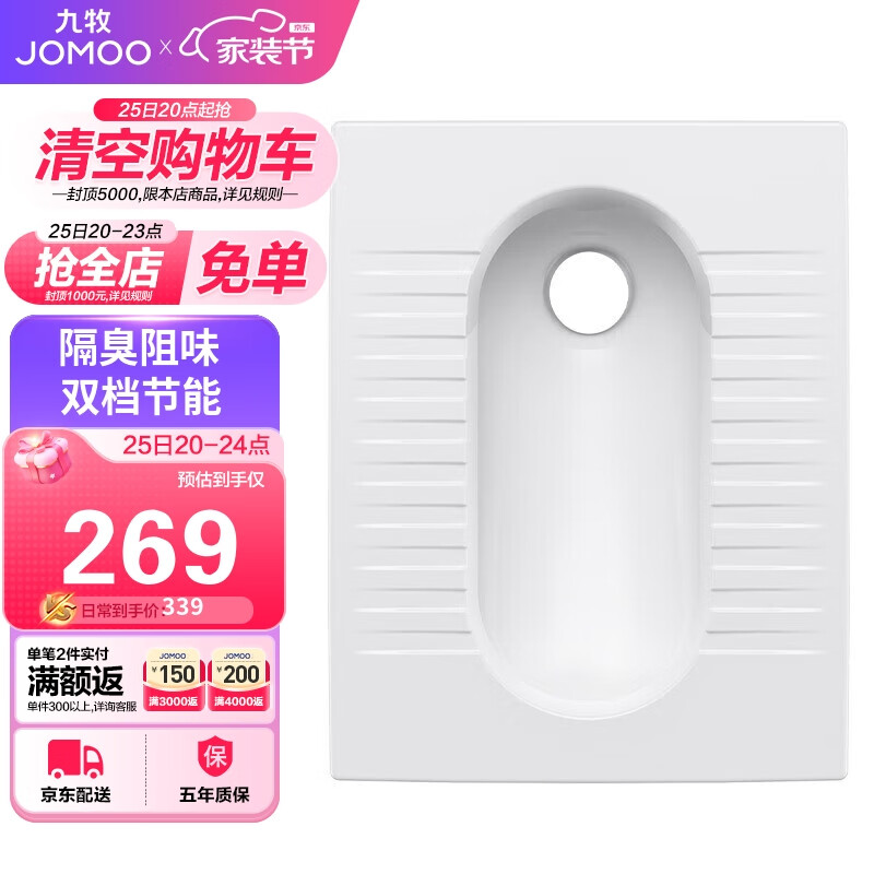 九牧(JOMOO)蹲便器家用蹲坑防臭易清洁陶瓷后排水不带存水弯14136-1/11P-1价格:309.00元!