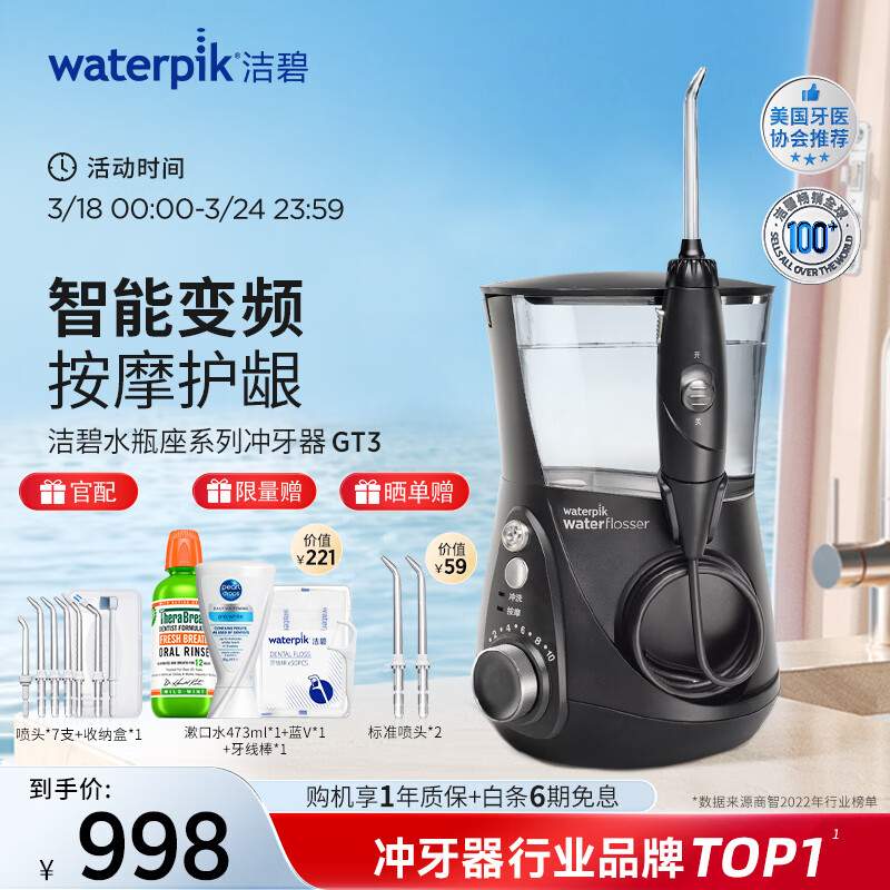 洁碧(Waterpik)冲牙器便携式电动洗牙器水牙线洁牙器家用立式预防牙结石全身水洗 水瓶座GT3-22 礼物价格:998.00元!