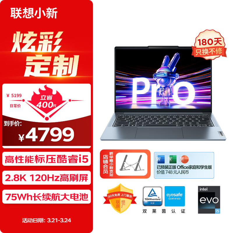 联想笔记本电脑小新Pro14超能本 高性能酷睿标压i5 14英寸轻薄本 16G 1T 2.8K高刷护眼屏 蓝 游戏价格:4799.00元!