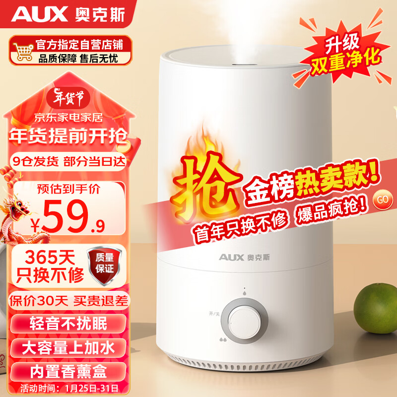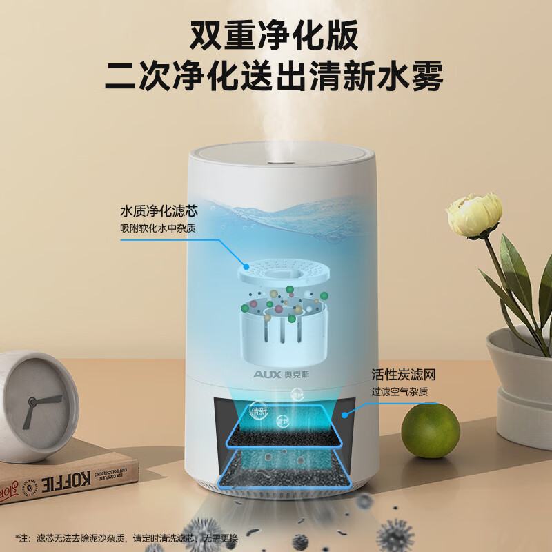奥克斯(AUX)加湿器卧室婴儿 家用上加水大容量卧室办公室空气净化 母婴香薰加湿价格:59.90元!
