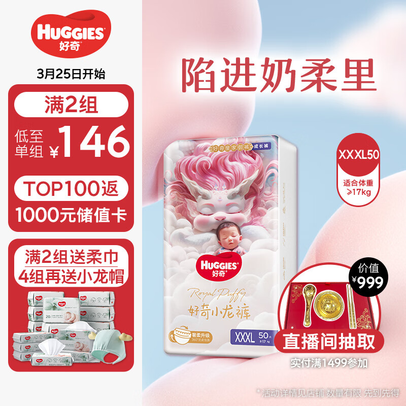 好奇(Huggies)皇家御裤小龙裤成长裤XXXL50片(17kg以上)尿不湿拉拉裤龙纹裤价格:157.00元!