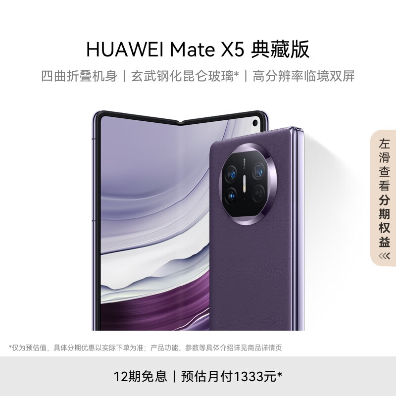 华为(HUAWEI) Mate X5 典藏版 折叠屏手机 16GB+512GB 幻影紫价格:15999.00元!
