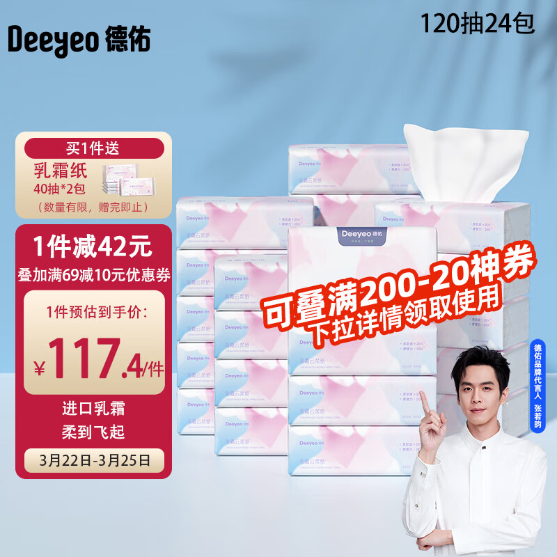 德佑云柔巾婴儿专用乳霜纸超柔纸巾抽纸宝宝云柔巾家庭装120抽24包价格:169.40元!