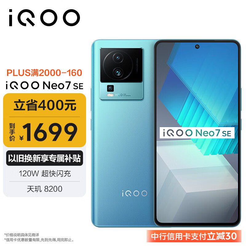vivo iQOO Neo7 SE 12GB+512GB 电子蓝 天玑8200 120W超快闪充 120Hz柔性直屏 5G游戏电竞性能手机价格:2099.00元!