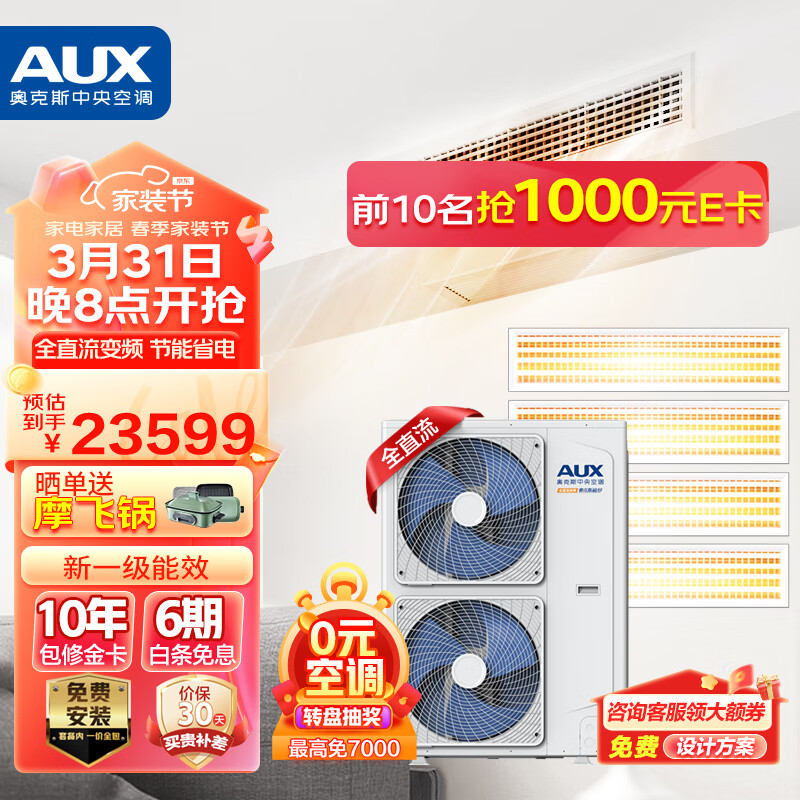 奥克斯(AUX)中央空调一拖四风管机空调6匹三室一厅家用多联机全直流变频一级能效嵌入式空调DLR-140W/DCJ2S-JM价格:23599.00元!