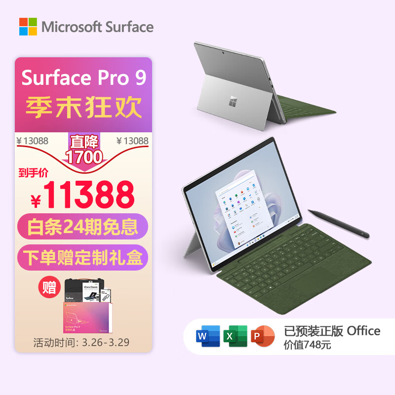 微软Surface Pro 9 亮铂金+森野绿带触控笔键盘盖 i5 16G+256G 二合一平板电脑 13英寸120Hz屏 办公本价格:11388.00元!