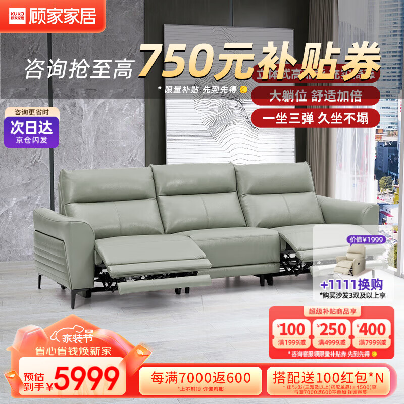 顾家家居(KUKA)头层牛皮沙发客厅高脚功能沙发小户型6055绿3双2电动【京仓闪发】价格:5999.00元!