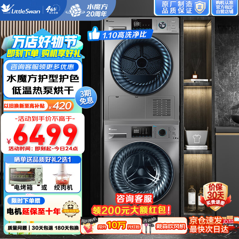 小天鹅(LittleSwan)水魔方洗烘套装 10KG全自动变频家用洗衣机+10KG护衣除菌烘干机 烘被子防缠绕 以旧换新 868+868价格:6499.00元!