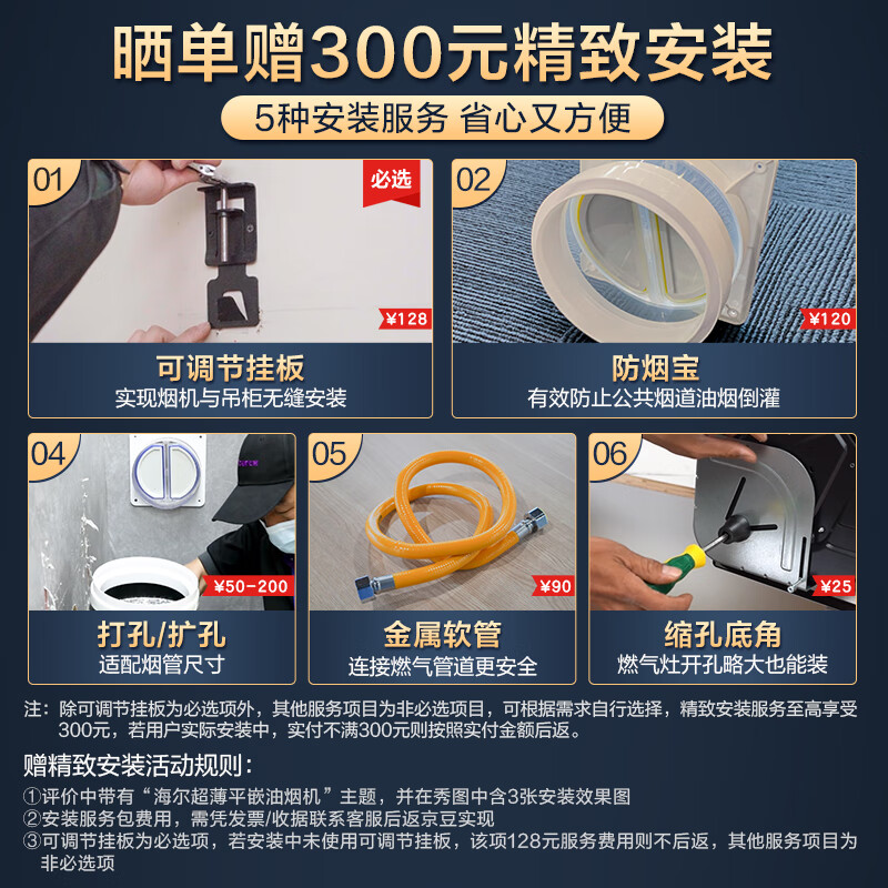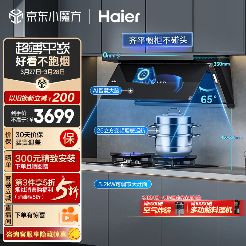海尔(Haier)抽油烟机 超薄近吸烟灶套装 25m3/min变频有效风顶侧双吸外观 家用吸油烟机燃气灶具C21U1+Q7BE3天价格:3699.00元!